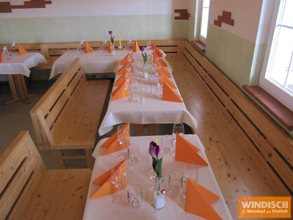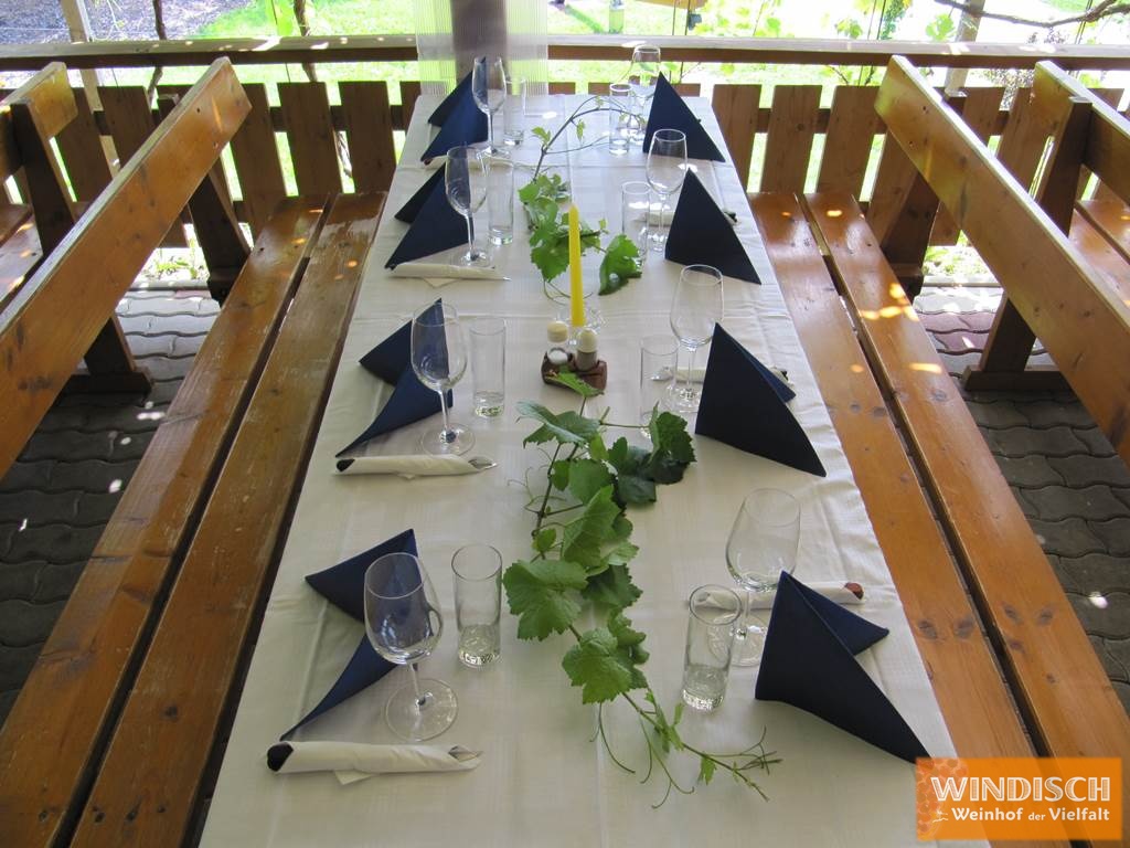 Our winery consists of a newly renovated Stüberl with room for up to 50 people, a conservatory-like annexe with room for up to 30 people, a lovingly designed rain-proof natural arbour with room for 60 people and an open-air terrace with three tables (25 people), from which you have a wonderful view of the wine landscape.